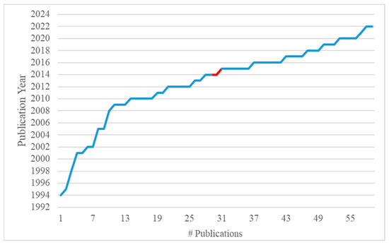 Annual rate of publications about FT-IR detection of EVOO adulteration over the period 1995–2022. Data retrieved from the Web of Science, Scopus and Google Scholar databases using various combinations of the keywords “virgin olive oil” AND “adulteration” AND “FTIR” in the search topics (last search: July 2022). The red segment depicts the shift to more systematic research during the last quarter of the publication period (2015 onwards).
