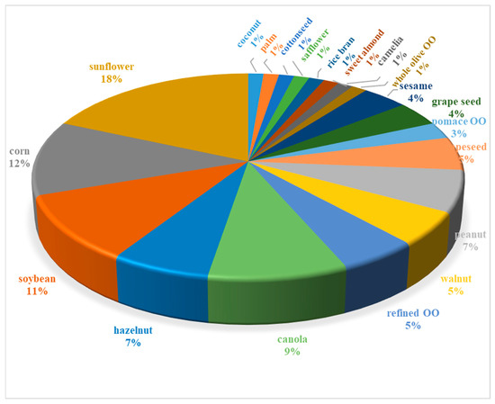 As far as it concerns the sampling of refined vegetable or seed oils used as EVOO adulterants, details are poorly recorded (Figure 4b); the available data signify that collections per type of botanical origin are rather small (e.g., 1 up to 10 samples) and may represent a possible batch-to-batch compositional variation.