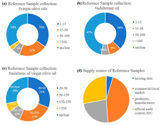The schemes in Figure 4a–c illustrate methodological trends regarding the size and the supply source of the sample collection used to create the reference spectra in each study. It is striking that almost 1/3 of the relevant publications reported poor details about their sampling method. The rest of the studies were classified basically into two groups that both corresponded to relatively small collections of reference spectra. The latter corresponded to either less than 15 or from 20 to 50 different samples of pure EVOO. In cases where the collection contained only a few average spectra (up to 15), they would rather represent different commercial EVOO brands with no tracking records on origin and production year. Very often, different batches of the same brand were purchased from the local market and mixed before analyses. Other investigators used mixtures of different commercial brands to reduce the heterogeneity of the reference sample set. Thus, compositional variation of authentic EVOO due to, e.g., cultivar, origin of production or harvest year, was seldom provisioned in the reference spectral data of the adulteration studies under review. When this condition was met, samples representing different geographical origin would be purchased from various international markets [27] or from producers [61] without any complementary purity control. In the cases where the collection counted up to 50 [49,50,53,55,62,63,64] and even more than 90 average spectra for EVOO [59,65], the sampling pattern was more complex; it seems that multiple sources other than the local market were used for the collection of pure EVOOs. Most probably, the researchers collaborated with producers, manufacturers, other colleagues, national authorities and official laboratories, as well as the IOC, to gain confidence about cultivar/geographical origin or quality parameters of the collected oils. The use of an in-house reference spectral library with available metadata for authentic EVOO/VOOs has also been exploited, as reported very recently [59]. Our survey showed that regardless of the supply source, only a third of the studies under review have attained accompanying analytical data with, e.g., fatty acid content of the samples, as additional purity indices of their reference samples [50,58,59,64,65,66,67,68,69,70,71].