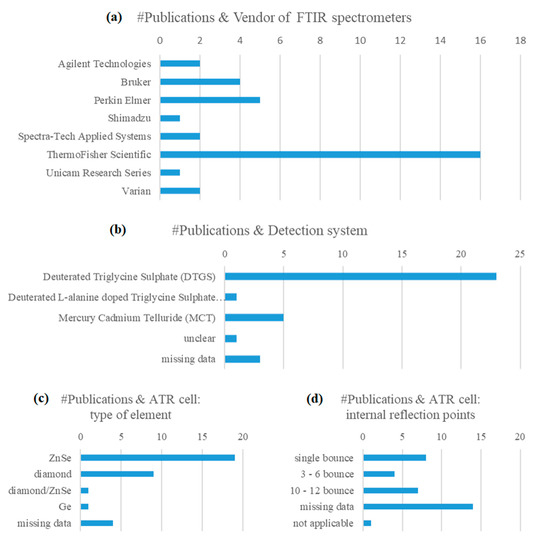 A standardized operating procedure for the preparation of the sample and subsequent measurements is necessary to evaluate data with the same statistical methods and develop sustainable models [74]. Our literature search indicated that the instrumental parameters and conditions of measurement are presented with highly varying degrees of detail in the articles under review. Reasonably, a variety of instrument models and sampling accessories from different vendors, as well as measurement protocols, have been used over the years. Relevant trends are highlighted in Figure 5a–d. Deuterated Triglycine Sulphate (DTGS) coupled with KBr optic system is a common detector system of FTIR spectrometers and, by far, the most frequently reported in the articles under review. Mercury-cadmium-telluride (HgCdTe, MCT), being more sensitive than common DTGS detector, but with lower dynamic range, plus the requirement for cooling (e.g., liquid nitrogen), followed next in frequency of report [27,50,53,58,62].