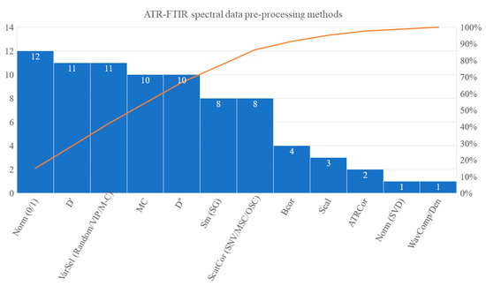 Variation in the spectral acquisition conditions, instrumental accuracy, inherent physical and compositional characteristics of the samples or experimental errors affect the quality of the obtained spectra and account for possible artifacts, such as noise, baseline shifts, slope, scatter effects, etc. Artifacts are not always easy to identify visually, as they involve combinations rather than individual bands. Thus, it is necessary to pre-process the raw data via various mathematical functions in order to remove these artifacts and obtain cleaned data that will better fit to the goal of chemometric analysis [41]. It is generally accepted that the method(s) of pre-processing can also introduce unwanted, irrelevant variation to the data; hence, their choice can be critical for the success of the entire experiment. However, objective criteria for the selection of the “best” spectral pre-processing methods for different types of spectral signals are not clear yet. In their review article, Lee et al. [43] stressed that it is not possible to draw any objective criteria, nor to propose a user-friendly tool to rapidly evaluate the performance of the pre-processing methods. In this section, we tried to deploy a strategy of selection and application of those methods by overviewing the relevant records in the studies under review. One out of the originally selected 31 publications [77] was excluded, as it did not apply chemometrics. The Pareto chart in Figure 6 shows the most widespread data-preprocessing methods, regardless of the sampling, measurement conditions or modeling methods used.