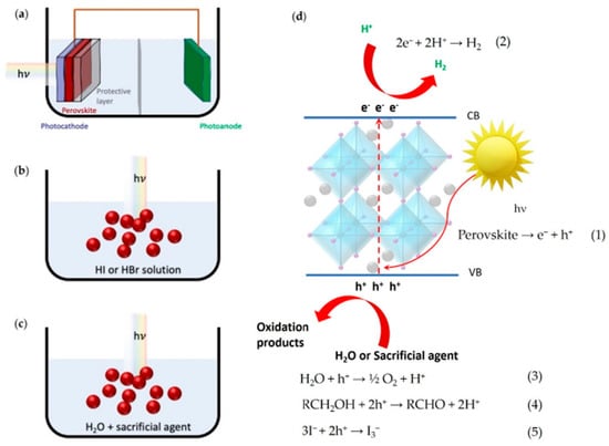 Figure 2. Solar-driven perovskite-based H2 production system: (a) photoelectrochemical (PEC) cell; (b) particulate photocatalyst system in dynamic equilibrium with the corresponding halogen acid; (c) particulate water-stable photocatalyst system. (d) Schematic representation of the processes on the perovskite photocatalyst surface under irradiation and possible reactions involved in the different systems [19].