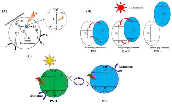 Figure 3. (A) Schematic illustration showing the electron-hole pathways in a photocatalytic process. (B) Schematic illustration showing three different types of semiconductor heterojunctions for photo-generated charge separation. (C) Schematic illustration of a Z-scheme photocatalytic system under light illumination [6,28,29]. Source A reprinted with permission from ref [28]: Copyright 1995 American Chemical Society [28]. B, C reprinted with permission from ref [29]: Copyright 2017, Jhon Wiley & Sons., Inc. [29].