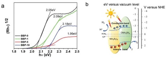 In 2020 Tang et al. reported a successful in situ growth of heterojunctions developed at the interface of MA3Bi2I9 and tri(dimethylammonium)hexa-iodobismuthate (DMA3BiI6) by a facile solvent engineering technique [32]. They confirmed that air-stable MA3Bi2I9/DMA3BiI6 perovskite heterojunctions can reinforce the efficiency of photogenerated carrier separation and transport, eventually enhancing solar HI splitting efficiency in the absence of noble metal co-catalysts. The authors prepared several samples exploiting a solvothermal synthesis where isopropanol (IPA) was employed as a solvent with DMF added as a co-solvent. Ultraviolet–visible diffuse reflectance spectroscopy and XPS valence band spectroscopy were carried out to construct the band structure of all the prepared powder samples, labeled as BBP-x (bismuth-based perovskites with x = 0, 1, 5, and 10 volume percent of DMF in IPA). All the samples exhibited visible light absorption ranging from 300 to 650 nm. Through a Tauc plot (Figure 5a), they determined the optical bandgap energy of all the powder samples showing that those values were suitable for visible light-induced photocatalytic reaction, and from 5b, it is possible to observe the results for the energy level diagram of the BBP-5 with a heterojunction of MA3Bi2I9 and DMA3BiI9 for the HI splitting showing an efficient Type II heterojunction [32].