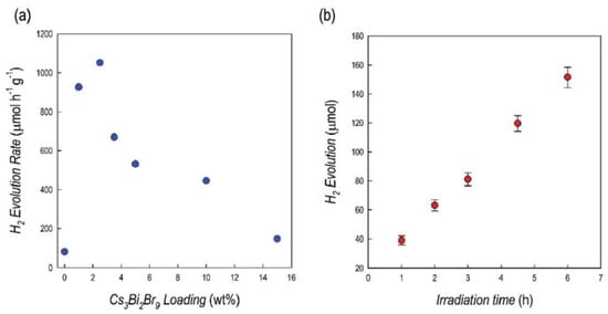 Figure 7. (a) Hydrogen evolution rates for Cs3Bi2Br9/g-C3N4 composites (1 g L−1) at different percentages of MHP loading in 10% v/v TEOA aqueous solution with Pt 3 wt%, under simulated solar light. (b) Hydrogen evolution profile over irradiation time for the 2.5% wt% Cs3Bi2Br9/g-C3N4 composites, under simulated solar light [35].