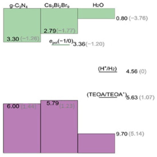 The alignment of the band edges between the constituents of the composite, shown in Figure 8, should boost the efficient charge separation; therefore, photogenerated holes in the valence band (VB) of g-C3N4 may migrate to that of Cs3Bi2Br9 while, in turn, photoexcited electrons in Cs3Bi2Br9 are transferred to the conduction band (CB) of g-C3N4. The efficient separation and transport of photoinduced electrons and holes induced by such an advantageous alignment of energy levels may hinder the bimolecular recombination of the charge carriers, thus enhancing the photocatalytic activity of the composite with respect to the separated materials.