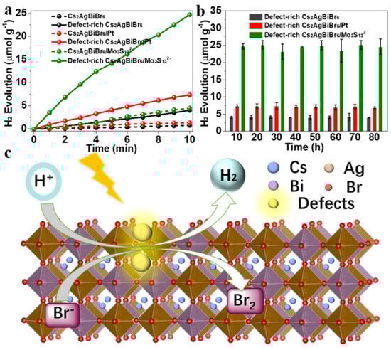 The formation of the defect-rich surface was carried out by simple irradiation of the perovskite solution with a 300 W Xe-lamp fitted with a 420 nm cut-off filter. Cs2AgBiBr6, after irradiation treatment, showed no additional diffraction peaks, confirming a high phase purity of the obtained sample, a result further corroborated by SEM and TEM measurements. The H2 generation of the defect-rich Cs2AgBiBr6 was investigated by exploiting a light intensity of 332.5 mW cm−2 with a visible light irradiation λ > 420 nm and evolved 4.06 µmol g−1 of H2 within 10 h, much higher compared with the amount generated by the pristine Cs2AgBiBr6 (0.77 µmol g−1). However, once the photocatalyst was deposited together with Pt or Mo3S132− nanoclusters as co-catalyst, the photocatalyst activity of the defect-rich Cs2AgBiBr6/Pt and defect-rich Cs2AgBiBr6/Mo3S132− increased up to 7.33 and 24.7 µmol g−1. Therefore, as shown in Figure 8c, the induction of surface defects can greatly improve the photocatalytic activity and stability of Cs2AgBiBr6 [39].