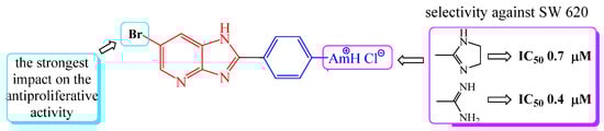 The results were compared to etoposide and doxorubicine as standard antitumor drugs. All derivatives showed moderate to strong antiproliferative activity against at least one of these cell lines, with the exception of compounds 9, 12, 13 and 17. Compounds 5, 6 and 18 displayed selectivity towards HeLa cells, while compounds 10 and 11 showed activity against both HeLa and SW620 cells. The bromo-substituted imidazo[4,5-b]pyridine 8 bearing a 4-cyanophenyl group at position 2 potently inhibited proliferation of all three cell lines (IC50 1.8–3.2 μM). Generally, we can conclude that the substitution of the pyridine nuclei with bromine markedly increased the antiproliferative activity of the tested imidazo[4,5-b]pyridines (Figure 3). The most promising activity was observed for compound 10, a bromo-substituted derivative bearing an unsubstituted amidino group at the phenyl ring, and (once again) compound 14, the bromo-substituted derivative bearing a 2-imidazolinyl group at the phenyl ring. Both derivatives showed inhibitory activity at sub-micromolar concentrations against colon carcinoma (SW620), with IC50 values of 0.4 and 0.7 µM, respectively. The N-methyl-substituted derivative 18 showed decreased antiproliferative activity in comparison with the N-unsubstituted analogues 6–8.