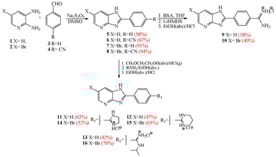 Novel amidino-substituted 2-phenyl-substituted imidazo[4,5-b]pyridines 9–10 and 11–16 were synthesized as presented in Scheme 1.