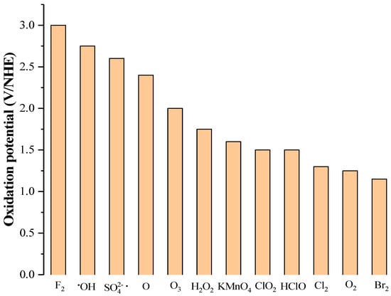 Advanced oxidation processes (AOPs) have been extensively studied for the treatment of organic pollutants. AOPs are very efficient degradation treatments for bio-refractory substances, since they involve the generation of hydroxyl radicals (•OH). Indeed, hydroxyl radicals are very reactive species, which attack pollutants with kinetic constants higher than 106–109 L mol−1 s−1. Figure 2 shows the oxidation potentials of common oxidants used in the depollution processes. Although the oxidation potential of •OH depends on the pH, it is a strong oxidant whose oxidation potential is just below those of fluorine [58,59]. Most AOPs use hydroxyl radicals or sulfate radicals SO4•− which are also very strong oxidants (Figure 2).