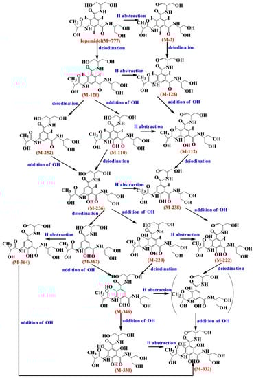In a relatively early study, Tusnelda and Fritz [84] showed that the photocatalytic degradation of both iomeprol and iopromide can be achieved using different TiO2 powder in aqueous solutions. However, the results indicated that a fast transformation but not complete mineralization or deiodination of the iodinated organic compounds occurs. In the study of Fu-Xiang et al [85], UPLC-ESI-MS with the total ion chromatograms (TIC) mode and the selected ion monitoring (SIM) mode were applied for analyzing the photodegradation intermediates of iopamidol. The postulated structures for the photodegradation products of iopamidol during UV irradiation were summarized (Figure 3). The photocatalytic oxidation of diatrizoate led to a low mineralization of the molecule, but a stoichiometric amount of iodide ions could be released [81].