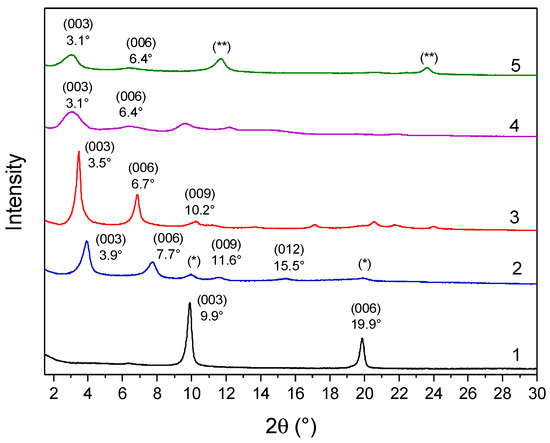 XRD patterns of samples LDH-NO3 (1), LDH-RA (2), LDH-DS/RA (3), LDH-GA (4), and LDH-DS/GA (5). Reflections (*) are likely due to a small fraction of unexchanged LDH-NO3. Reflection (**) at 11.7° and 23.6° are probably due to the intercalation of carbonate anions that occurred during the preparation or purification of the host–guest system.