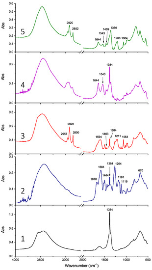 FT-IR spectra of samples LDH-NO3 (1), LDH-RA (2), LDH-DS/RA (3), LDH-GA (4), and LDH-DS/GA (5).