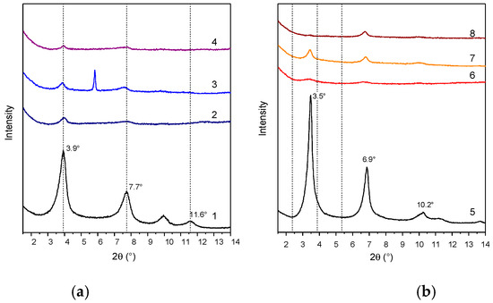 XRD patterns of LDH-RA (1), PLA/LDH-RA (2), PBS/LDH-RA (3), and PLA/PBS/LDH-RA (4) (a) and LDH-DS/RA (5), PLA/LDH-DS/RA (6), PBS/LDH-DS/RA (7), and PLA/PBS/LDH-DS/RA (8) (b). The signal at 5.8° (2θ) in the XRD pattern of PBS/LDH-RA (3) is due to the presence of impurity.