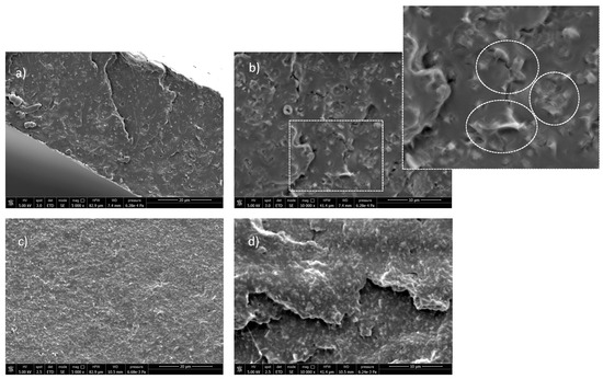 Interestingly, the low-magnification SEM images of PLA/LDH-DS/RA (Figure 6a) showed a relatively homogeneous morphology. At the same time, at higher magnification (Figure 6b), numerous well-dispersed and evenly distributed structures were visible in the polymer phase due to LDH layers. The lamellae may have been well embedded in the polymer and differently oriented from the surface. In the case of the PLA/LDH-DS/GA sample, SEM micrographs did not reveal the presence of LDH-DS/GA (Figure 6c,d), suggesting a good dispersion and distribution of lamellae, down to the nanoscale, and confirming the XRD data.