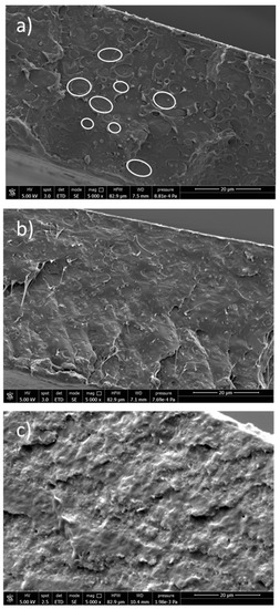 SEM images of the PLA/PBS mixture (Figure 7a) showed phase separation due to the immiscibility of PLA and PBS [9]. Spherical and nearly spherical PBS droplets with smooth surfaces and variable sizes appeared coarsely dispersed in the PLA matrix, showing poor adhesion between the phases.