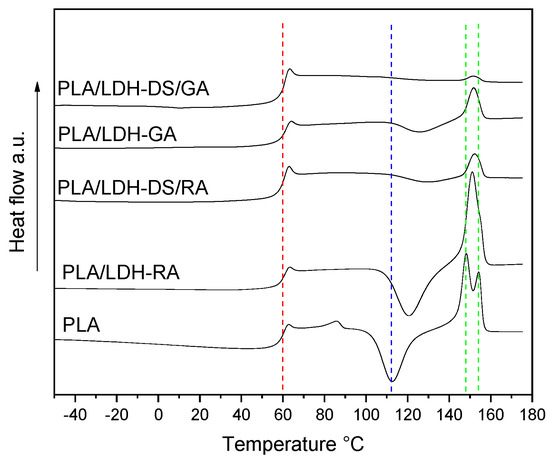 DSC curves (2nd heating) of PLA, PLA/LDH-RA, PLA/LDH-GA, PLA/LDH-DS/RA, and PLA/LDH-DS/GA. The red, blue, and green dashed lines indicate the fundamental transitions of pure PLA: glass transition, cold crystallization, and melting.