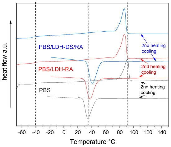 DSC curves (2nd heating and cooling) of PBS, PBS/LDH-RA, and PBS/LDH-DS/RA. Dashed lines indicate the fundamental transitions of pure PBS: glass transition, crystallization, and melting.