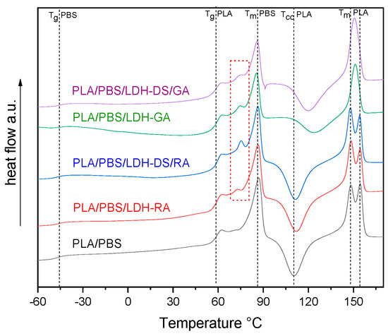 DSC analysis of PLA/PBS blend evidenced the typical behavior of scarcely compatible polymers, showing all the transitions of PLA and PBS alone (Figure S6). The DSC curves of the PLA/PBS composites showed unchanged Tg values for both polymer phases (Figure 10), confirming the immiscibility of polymers. However, variations in the cold crystallization temperature and the shape of the PLA melting peak are evident, especially in the composites containing LDH-GA and LDH-DS/GA. Indeed, the Tcc of the PLA phase was about 14 and 10 °C higher than that of the PLA/PBS blend, respectively, and the peak was quite broad compared with that of the pure matrix. This shift and the peak broadening suggest that the cold crystallization of PLA was partially hindered by the increased number of interfaces that strengthened the adhesion between the two polymer phases. This evidence confirms the morphological analysis results that show a finer dispersion of the PBS phase for all composites containing the co-intercalated LDH. Finally, in the samples containing LDH-GA and LDH-DS/GA, there was only one melting peak of the PLA phase at a temperature between the two peaks of the PLA/PBS blend. Furthermore, the melting temperature of the PBS phase in all composites does not change from that of the PLA/PBS blend, although a decrease in the melting enthalpy is observed in the composites containing LDH-GA and LDH-DS/GA. Interestingly, an additional endothermic transition is observed for all composites at about 72–75 °C (red dashed square in Figure 10). This new transition, which may be associated with a third phase, is located between the glass transition of PLA and the melting of PBS. LDH embedded in the PLA/PBS matrix probably forms intercalated macroaggregate structures (observed in the SEM micrographs) in which some polymer fractions crystallize, and LDH acts as a heterogeneous nucleating agent.
