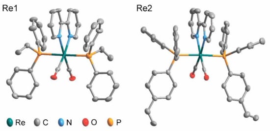 The symmetrical structure of complexes Re1 and Re2 was also confirmed by XRD analysis. Single crystals suitable for the X-ray crystallographic study were obtained by gas-phase diffusion of diethyl ether into a chloroform solution of these complexes. An Oak Ridge Thermal Ellipsoid Plot (ORTEP) view of complexes Re1 and Re2 is shown in Figure 1, and selected bond lengths and angles are summarized in Table S1.