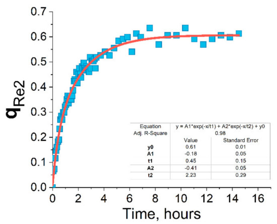 Since the difference in the number of protons in the p(VP) blocks and in the Re complexes is very large, the signals from the emitter ligands in the 1H NMR spectra (Figures S8 and S9) are nondetectable. However, the presence of the signals in the 31P NMR spectra (Figures S8 and S9) clearly indicates the conjugation of the Re(I) compounds to the p(VP) copolymers. The positions of the 31P NMR signals are in agreement with those found for the initial (non-polymerized) metal complexes (Figures S2–S5 and S8, S9). The copolymerization of rhenium complexes has also been monitored by the disappearance of the double bond signal (5.88 ppm, Re2) in the 1H NMR spectra in the course of reaction. The time dependence of conversion (q) was calculated using Equation S1 and is shown in Figure 2. It was established that in the case of Re2 copolymerization the conversion reaches saturation in 6 h to give the final magnitude of ca. 0.6. It is worth noting that due to the limitations of NMR measurements the monitoring was carried out in the less concentrated solutions, compared to the synthetic reaction conditions, which means that the conversion in the latter case is most probably to be even higher.