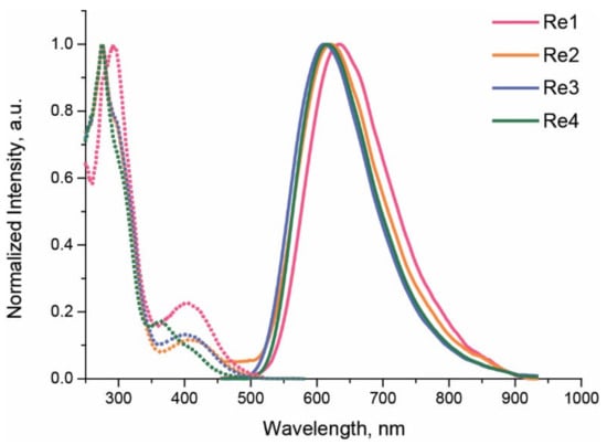 In methanol solution, the complexes under study display orange luminescence with structureless emission band profiles (Figure 3) and lifetimes in the microsecond domain, mainly characterized by the 3MLCT dπ(Re) → π*(N^N) nature of the excited states. The assignment of the phosphorescence to the 3MLCT character was made on the basis of obtained experimental results and theoretical analysis of closely analogous diphosphine Re(I) systems studied earlier [21,22]. The emission maxima for Re1–Re4 are listed in Table 2, along with the respective emission quantum yields, excited state lifetime, and rate constants of radiative and nonradiative relaxation.