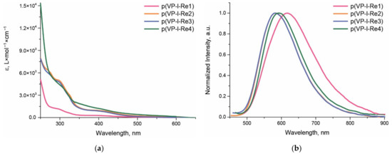 (a) Electronic absorption spectra of p(VP-l-Re) and (b) normalized emission spectra of p(VP-l-Re), excitation at 365 nm, H2O, 20 °C.