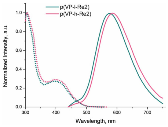 The synthetic routes and chemical structure of the obtained Re(I)-containing copolymers are shown in Scheme 2. At the first stage, the low (p(VP-l)) and high (p(VP-h)) molecular polyvinylpyrrolidone macro-RAFT agents were prepared. Their mass average molecular weight was determined using gel-permeation chromatography (GPC, Table 1) to give 4600 and 67000 D for (p(VP-l)) and (p(VP-h)), respectively. The 1H NMR spectra of these products (Figure S7) are completely compatible with the structural patterns shown in Scheme 2. Interestingly, p(VP-l) displayed a polydispersity coefficient (Ɖ) as low as 1.14 while the magnitude obtained for p(VP-h) was 1.59, which indicates better compatibility of RAFT1 to N-vinylpyrrolidone, in agreement with the results published earlier [28].