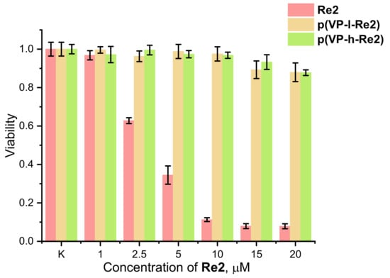 The toxicity of the Re2 complex and its conjugates with polymers was evaluated using the MTT method, see Figure 6. The toxicity of the copolymers was measured in relation to the molar concentration of the rhenium complex calculated from the values of the Re2 loading into the copolymers, see Table 1. Comparative analysis of the data given in Figure 6 indicates that the complex is significantly more toxic even at relatively low (2.5 μM) concentrations, LC50 = 3.2 μM. Conjugation of the rhenium centers to the polymer reduces the copolymer toxicity and a viability rate above 80% is observed up to the concentration of 20 μM. Based on these findings, non-toxic concentrations of the copolymers, 5 μM, and moderately toxic concentration of Re2, 2.5 μM, were selected for the cell experiments under 24-h incubation.