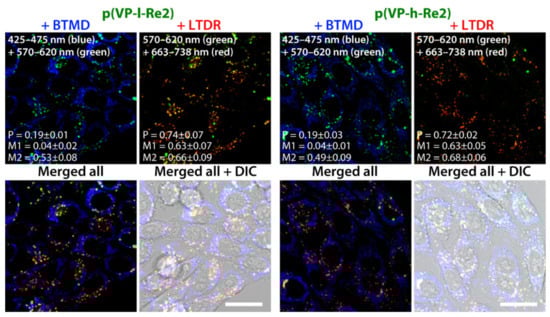 Subcellular distribution of BioTracker 405 Blue Mitochondria Dye (BTMD, blue, 425–475 nm), p(VP-l-Re2) and p(VP-h-Re2) (green, 570–620 nm, 5 µM, 24 h), and LysoTracker Deep Red (LTDR, red, 663–738 nm) in living CHO-K1 cells. Pearson’s (P) and Manders’ overlap coefficients (M1—fraction of first channel that overlaps second channel, M2—fraction of second channel that overlaps first channel) are presented as mean ± standard deviation calculated for 25 cells. Scale bar 20 µm.