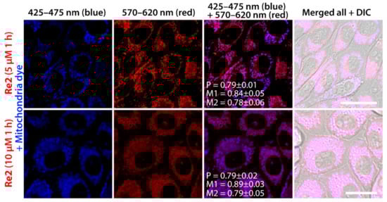 Subcellular distribution of BioTracker 405 Blue Mitochondria Dye (blue, 425–475 nm), Re2 (red, 570–620 nm, top: 5 µM, 1 h, bottom: 10 µM, 1 h) in living CHO-K1 cells. Pearson’s (P) and Manders’ overlap coefficients (M1—fraction of first channel that overlaps second channel, M2—fraction of second channel that overlaps first channel) are presented as mean ± standard deviation calculated for 25 cells. Scale bar 20 µm.
