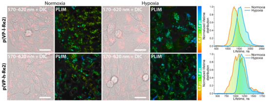 Confocal images (λex = 405 nm, λem = 570–620 nm) merged with differential interference contrast (DIC), PLIM images of CHO-K1 cells incubated with p(VP-l-Re2) and p(VP-h-Re2) at a concentration of 5 µM of Re complex under normoxia and hypoxia conditions, and lifetime distributions for corresponding PLIM images.