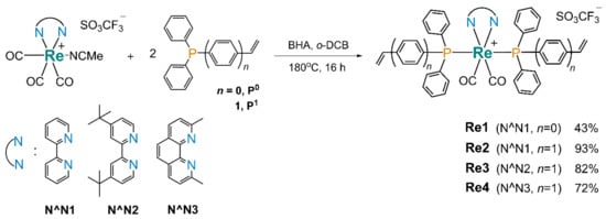 The synthesis of four new bis-phosphine Re(I) complexes required extreme temperature conditions. The reaction of the [Re(CO)3(N^N)(NCMe)]OTf precursors with the corresponding phosphine ligands was carried out in boiling o-dichlorobenzene in the presence of butylhydroxyanisole (BHA) to prevent the vinyl group thermal self-polymerization as shown in Scheme 1. This approach enabled the synthesis of various Re(I)-based complexes as the parent compounds for preparation of the macromolecular metal complexes. The choice in favor of the titled diimines was dictated by high quantum efficiency of the related Re(I) species [20], whereas the phosphine ligands with the vinyl/styrene groups have been used as convenient participants of a copolymerization reaction between the rhenium phosphine complexes and polyvinylpyrrolidone, aimed at the solubilization of the target compounds in aqueous media. The yields of these reactions vary from moderate to good (up to ca. 93%) for all Re(I) phosphine derivatives.