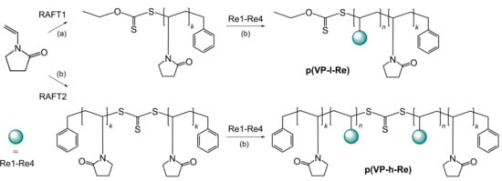 Our choice was to use the reversible addition-fragmentation chain transfer (RAFT) block copolymerization of the rhenium complexes with polyvinylpyrrolidone p(VP), which was used as a macro-RAFT agent. p(VP) was selected due to its long-term stability, water-solubility, low toxicity [19], and reduced oxygen permeability [24,25]. The initial p(VP) and the corresponding block copolymers were prepared as two series with different lengths of the p(VP) chains based on application of two RAFT agents: 1-(O-ethylxanthyl)methylbenzene (RAFT1, low molecular polymer) [26] and S,S-dibenzyltrithiocarbonate (RAFT2, high molecular polymer) [27]. As a result, the metal containing block copolymers contain either one p(VP) fragment (low molecular block-copolymer, p(VP-l-Re)), or two p(VP) fragments (high molecular block-copolymer, p(VP-h-Re)), that allows the analysis of the influence of the p(VP) molecular weight on the photoluminescence behavior of the Re(I)-containing copolymers.