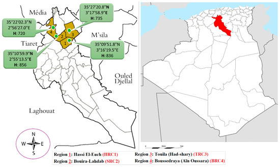 The samples of the unripe fruit of P. atlantica were collected in August 2018, from four different parts of Djelfa province, Algeria; the first region is Hassi El Ouch, which is symbolized by (HRC1); (Latitude: 35°09′51.8″ N; Longitude: 3°16′19.5″ E; Altitude: 836 m). The second region is Bouira–Al Hadab (SRC2); (Latitude: 35°10′59.9″ N; Longitude: 2°55′13.5″ E, Altitude: 856 m). The third region is Touila-Had shary (TRC3); (Latitude: 35°27′20.8″ N; Longitude: 3°17′58.9″ E; Altitude: 735 m). The fourth region is Bousraya Ain Oussara (BRC4); (Latitude: 35°22′2.3″ N; Longitude: 2°56′27.0″ E; Altitude: 720 m), (Figure 1). The plant material was botanically identified and confirmed by Professor M. Yousfi, Laghouat University, Algeria. The unripe fruit of P. atlantica were dried in the shade and away from sunlight and moisture for 2 weeks. After that, the samples were ground to a fine powder using an agate mortar, and the pestle passed through a 120 µm mesh sieve and stored in airtight containers. The samples were subsequently extracted by cold maceration using water destitution, where 10 g of each sample was extracted with distillation water (100 mL, 2 day cycles, and three times), using an ultrasonic technic. The resulting suspension was filtered through Whatman filter paper (No. 1) and condensed in a vacuum evaporator at 40 °C.