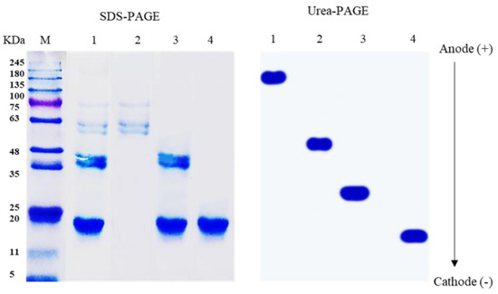 SDS-PAGE and Urea-PAGE of LPI (lane 1), 7S globulin (lane 2), 11S globulin (lane 3), and BS (lane 4) in comparison with protein marker (M).