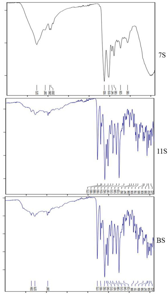 Finally, both 11S globulin and the BS were specifically characterized by high IR absorption at 3364 and 3278 cm−1, as well as 1693 and 1668 cm−1, distinguishing them from 7S globulin, which was correspondingly characterized by high absorption at 3272 cm−1 and 1630 cm−1.