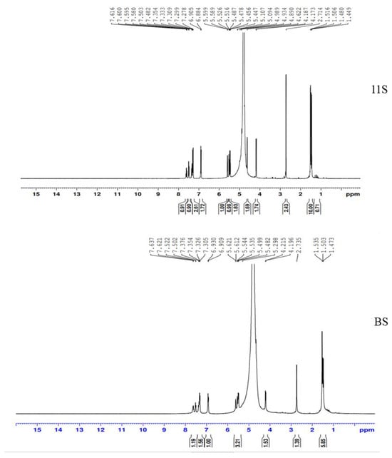 Similar NMR spectra were found for the lupine seed protein of 11S globulins (glycinin) and the basic subunit (BS), as shown in Figure 4. For 11S globulin, the spectrum showed 1H NMR (DMSO-d6): δ = 1.51 (s, 1H, CH3), 5.09 (s, 2H, OCH2), 5.44 (s, 1H, Ar-H), 7.48 (d, 1H, J = 6.8 Hz, Ar-H), 7.59 (d, 1H, J = 6.90 Hz, Ar-H), 7.27 (s, 1H, NH), and 7.58–7.66 (m, 3H, Ar-H).