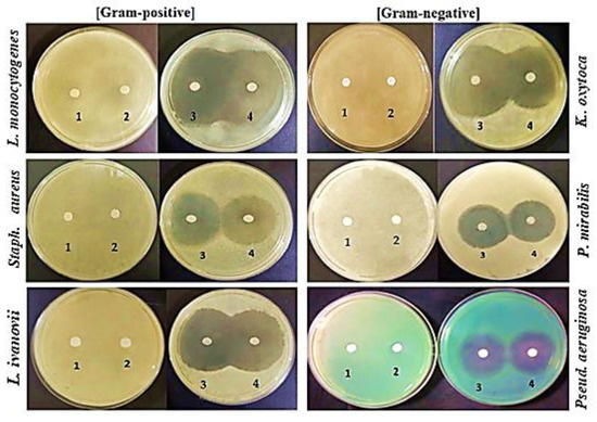 The data in Table 1 and Table 2 present the bacterial inhibitory actions of graded concentrations of lupine 11S globulin and BS using the disk and well diffusion assay techniques, as well as their statistical significance. The results of the two techniques (disk and well diffusion assays) were similar. The data in Table 1, Table 2 and Table 3 show that lupine 11S globulin had MIC values in the range of 0.1–4 µg/mL compared to the range of 0.05–2 µg/mL for lupine BS. Generally, in most cases the inhibition zone diameter induced by the BS was relatively higher than that induced by 11S globulin at the same concentration. The data in Table 1B and Table 2B demonstrate the significance of the differences in antibiotic activities of the tested substances. The antibacterial activity of the BS (Table 1B) could be classified into categories as follows: 26–28, 15–16, and 7–11 corresponding to L. monocytogenes and K. oxytoca; L. ivanovii and S. aureus; and P. mirabilis, P. aeruginosa, and S. typhimurium, respectively. The difference between the groups regarding microorganism effect was significant. Meanwhile, the antibacterial activity of 11S globulin (Table 2B) could be classified into categories as follows: 23–24, 16–17, and 12–13 corresponding to L. monocytogenes and K. oxytoca; L. ivanovii, S. aureus, and P. mirabilis; and P. aeruginosa and S. typhimurium, respectively. Therefore, the difference between the groups regarding microorganism effect was also significant in the case of 11S globulin. Increase in the tested protein concentrations resulted in significant increases in antibacterial activity (Table 1B and Table 2B). The significant increase caused by concentration referred to the essential role of the identified substances in inducing antibacterial action. Figure 6 illustrates the antibacterial effects of 11S globulin and the BS against S. aureus and K. oxytoca.