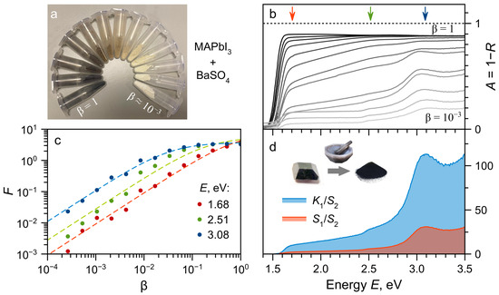 For a detailed illustration of the method, we chose the most studied and practically demanded three-dimensional halide perovskite MAPbI3 (MA+ = CH3). Single crystals of MAPbI3 were synthesised using the counterdiffusion-in-gel method [22]. The crystals were pulverized and mixed with BaSO4 powder. Figure 1a shows vials with mixed powders starting from pure MAPbI3 () with each following is diluted twice by mass with BaSO4. The DRS data in the form of are shown in Figure 1b. Note the ”saturation” of the spectra for due to the total absorption of light in the sample. Using these data to analyze the energy structure of the sample can lead to incorrect conclusions. For example, the measurement of the band gap energy using the apparent absorption edge could lead to the band gap underestimation. These data also do not allow extracting information about the energy structure of transitions in the absorption region. To obtain complete information about the spectral properties of the sample, the entire data array should be analyzed. Figure 1c shows the dependencies of the Kubelka–Munk transformation of DRS data on the volume fraction for three different energies (marked by arrows in Figure 1b). These sections could be fitted by Equation (3) yielding the relative absorption and scattering coefficients. Same fitting procedure was used for the whole set of DRS data. Figure 1d shows the relative absorption and scattering spectra for MAPbI3 material. The fundamental absorption of the material began around 1.6 eV, with two absorption edges of higher-lying states could be observed around 2.5 and 3.0 eV. This data is in a good agreement with transmission measurements of MAPbI3 thin films [23,24]. In this work, we do not want to discuss the nature of the observed states any further. However we would like to note that a correct description of interband absorption in a direct-gap semiconductor even above the exciton dissociation temperature requires the use of the Elliot formalism, which takes into account excitonic, as well as the electron-hole correlation effects. The relative absorption and relative scattering (Figure 1d) show similar spectral behaviour. Thus, their ratio in the expression for the Kubelka–Munk transformation (Equation (1)) is not very informative. One of the advantages of the proposed method of DRS with dilution is the ability to separate these contributions.