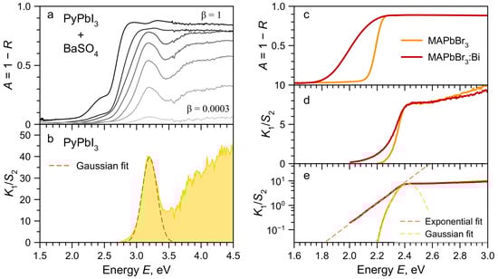 where K is absorption and S is scattering coefficients of the studied material. Although the function is usually taken as a close approximation of the absorption spectrum, care should be taken for strongly absorbing materials. The almost absent reflectivity from the sample () leads to the undefined value of F being very sensitive to any experimental errors. DRS measurements of semiconductors without the sample dilution allows to reliably determine only the defect-related absorption and the long-wavelength tail of the fundamental absorption. Thus, despite the general prevalence of the DRS equipment in labs, in the study of halide perovskites, with rare exceptions, DRS is used for obtaining nonsupporting data, and sometimes even for drawing incorrect conclusions. Also, we would like to point out that in halide perovskites it is necessary to use the Tauc formalism [15,16,17] with great care, since it is applicable for interband transitions in the absence of any absorption below the bandgap [18]. The presence of strong exciton transitions below requires the use instead the Elliot formalism [19,20] that takes such transitions into account. The presence of exciton transitions can also lead to the misinterpretation of them as the Urbach tail.