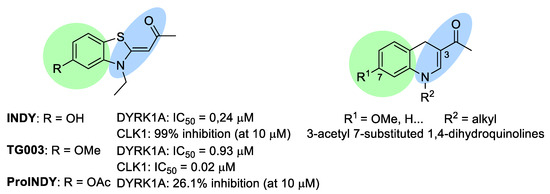 INDY, TG003 and ProINDY. INDY and TG003: DYRK1A/CLK1 inhibitors and structural analogies with 3-acetyl 7-substituted 1,4-dihydroquinolines.