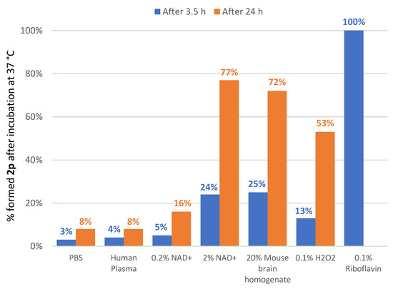 To evaluate the ability of 1,4-dihydroquinolines 1 to act as antioxidants, we studied their behavior by incubating them in different oxidative media [42] (NAD+, mouse brain homogenate, H2O2, riboflavin) (Figure 2). First of all, in vitro stability of the most potent inhibitor 1p was evaluated in PBS and human plasma at 37 °C. After 3.5 h incubation in these non-oxidizing media, only 3% of the oxidation product 2p was observed in PBS and 4% in human plasma (8% after 24 h for both media). This finding led us to predict a good stability of 1p at the periphery. Then, in the presence of the oxidizing medium consisting of 0.2% NAD+ in PBS, the oxidation rate of dihydroquinoline 1p was relatively low (5% after 3.5 h and 16% after 24 h). However, the formation of the oxidation product 2p was shown to be much faster when using 2% NAD+ (24% after 3.5 h and 77% after 24 h). A similar result was observed when 1p was exposed to 20% fresh mouse brain homogenate (25% after 3.5 h and 72% after 24 h), while hydrogen peroxide 0.1% appeared to be slightly less effective (13% after 3.5 h and 53% after 24 h). Finally, in vitro oxidation with 0.1% riboflavin showed an extremely rapid oxidative conversion of 1p into the corresponding quaternary salt 2p (100% in less than 3.5 h).