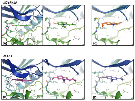 Two perpendicular views of (A) INDY inhibitor position from the hDYRK1 X-ray structure, and (B) INDY derivative TG003 position from the hCLK1 X-ray structure compared to the compound 1h positioned using the docking studies in the (C) hDYRK1A binding site and (D) hCLK1 binding site. The INDY, INDY derivative TG003, compound 1h and the selected residue or residue side chains of the binding site are in stick form and the protein in ribbon representation. This figure was made with PYMOL (DeLano Scientific, 2002, San Carlo, CA, USA).