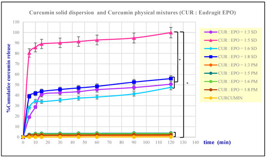 In vitro dissolution studies of curcumin, curcumin–Eudragit EPO solid dispersions and curcumin–Eudragit EPO physical mixtures at various ratios. Note: * denotes p-value < 0.01.