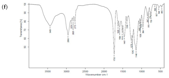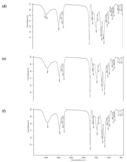 FTIR spectroscopy was used to identify the chemical functional groups and interactions between curcumin and Eudragit polymer. As illustrated in Figure 2 and Figure 3, the FTIR spectrum of curcumin (Figure 2) presented a broad band at 3505–3447 cm−1 corresponding to an O-H stretching vibration in the polyphenol compound in the structure of curcumin. Eudragit® EPO showed C=O stretching (carbonyl ester group) at 1731 cm−1, strong C-O absorption at 1149 cm−1, and a broad band with medium absorption due to amine (N-H) at 3437 cm−1 [35].