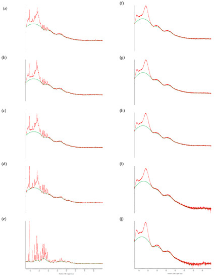 Powder X-ray diffractograms of curcumin physical mixture (CUR-PM) (a–d) in w/w ratios of (a) 1:8, (b) 1:6, (c) 1:5, and (d) 1:3; (e) curcumin extract; curcumin solid dispersion (CUR-SD) (f–i) in w/w ratios of (f) 1:8, (g) 1:6, (h) 1:5, and (i) 1:3; and (j) Eudragit EPO.