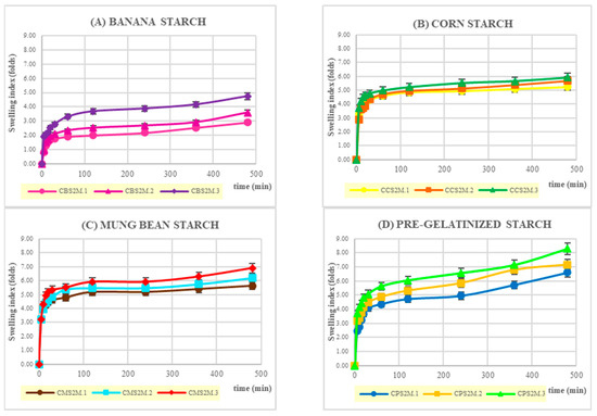 The swelling behavior of curcumin-loaded expandable films in SGF (simulated gastric fluid) is shown in Figure 5. With the same amount of starch, the increment of chitosan tended to decrease the swelling index of banana starch, pregelatinized starch, and mung bean starch. However, in the case of corn starch, there was no difference in the swelling ratio at different levels of chitosan content. Pregelatinized starch showed the highest values of swelling ratio, whereas banana starch had lowest swelling index.