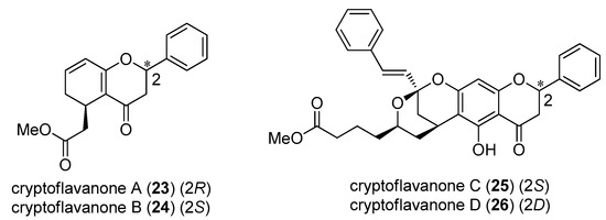 Four novel chiral A-ring flavonoids cryptoflavanones A-D (23–26) were isolated from the leaves of Cryptocarya chinensis [38]. The structures of these four compounds were determined using spectral analyses and are shown in Figure 6.