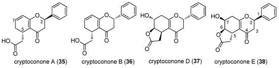 Three novel chiral A-ring flavonoids termed cryptogiones D–F (27–29) were isolated from the stem of a thick-shelled laurel plant Cryptocarya chingii [45] in 2012. The structures of the three compounds, shown in Figure 7, were elucidated by interpreting the comprehensive spectroscopic data and X-ray analysis.